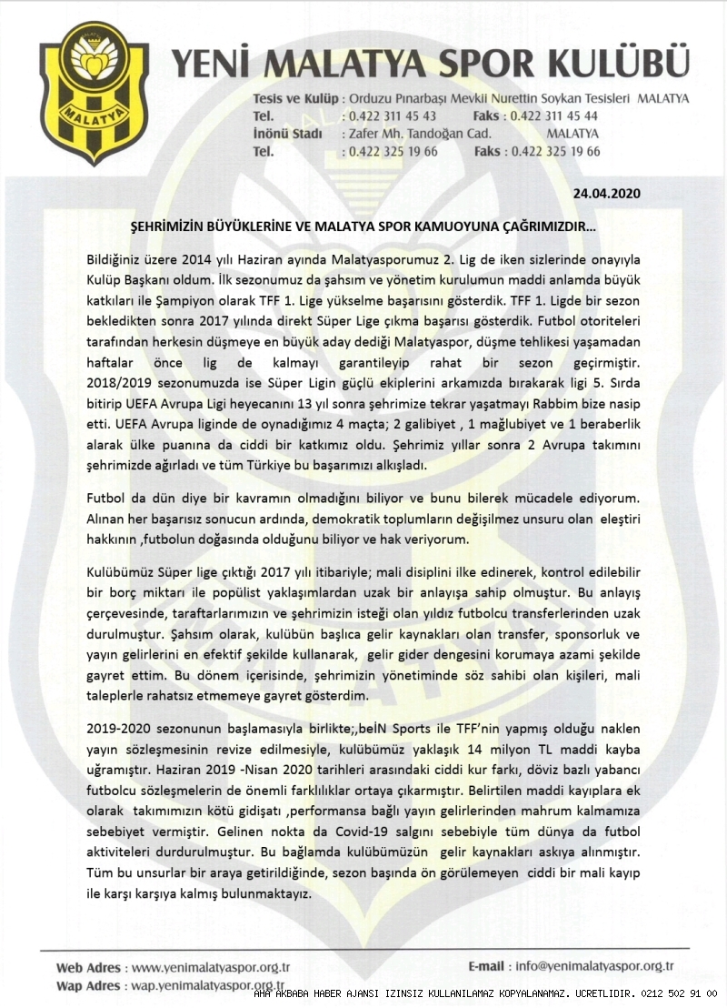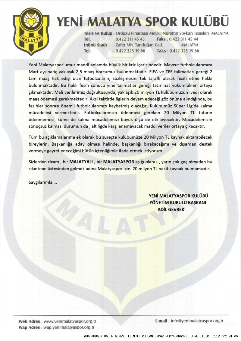 Başkan Adil Gevrek’in 2020’deki Tarihi Mektubu Yeniden GündemdeÖnceki dönem Yeni Malatyaspor Kulübü Başkanı Adil Gevrek’in 2020 yılında tüm siyasilere hitaben yazdığı mektup, yeniden gündeme geldi.O dönem kamuoyuna yansıyan mektup, Malatyaspor camiasında adeta şok etkisi yaratmıştı. Başkan Gevrek, kaleme aldığı satırlarda kulübün yaşadığı mali sıkıntıları tek tek sıralamış, pandemi sürecinin getirdiği ağır yükleri dile getirmiş ve şehrin ileri gelenlerini Malatyaspor’a sahip çıkmaya davet etmişti.Geçmişte yazılan bu mektubun, bugün Malatyaspor’un içinde bulunduğu şartları adeta öngördüğü dikkatlerden kaçmadı. Adil Gevrek’in o dönemde yaptığı uyarılar ve geleceğe dair öngörüleri, bugün yaşanan tabloyla birebir örtüşüyor.Başkan Gevrek, siyasilerin desteğinin kulübün ayakta kalması için hayati önem taşıdığını vurgulamış, aksi halde kulübün ciddi mali krizlerle karşı karşıya kalacağını ifade etmişti.Malatyaspor camiasında yeniden gündeme gelen bu mektup, “Adil Gevrek haklı çıktı” yorumlarını da beraberinde getirdi. Başkan Adil Gevrek mektubunda ŞEHRİMİZİN BÜYÜKLERİNE VE MALATYA SPOR KAMUOYUNA ÇAĞRIMIZDIR… Bildiğiniz üzere 2014 yılı Haziran ayında Malatyasporumuz 2. Lig de iken sizlerinde onayıyla Kulüp Başkanı oldum. İlk sezonumuz da şahsım ve yönetim kurulumun maddi anlamda büyük katkıları ile Şampiyon olarak TFF 1. Lige yükselme başarısını gösterdik. TFF 1. Ligde bir sezon bekledikten sonra 2017 yılında direkt Süper Lige çıkma başarısı gösterdik. Futbol otoriteleri tarafından herkesin düşmeye en büyük aday dediği Malatyaspor, düşme tehlikesi yaşamadan haftalar önce lig de kalmayı garantileyip rahat bir sezon geçirmiştir. 2018/2019 sezonumuzda ise Süper Ligin güçlü ekiplerini arkamızda bırakarak ligi 5. Sırda bitirip UEFA Avrupa Ligi heyecanını 13 yıl sonra şehrimize tekrar yaşatmayı Rabbim bize nasip etti. UEFA Avrupa liginde de oynadığımız 4 maçta; 2 galibiyet , 1 mağlubiyet ve 1 beraberlik alarak ülke puanına da ciddi bir katkımız oldu. Şehrimiz yıllar sonra 2 Avrupa takımını şehrimizde ağırladı ve tüm Türkiye bu başarımızı alkışladı. Futbol da dün diye bir kavramın olmadığını biliyor ve bunu bilerek mücadele ediyorum. Alınan her başarısız sonucun ardında, demokratik toplumların değişilmez unsuru olan eleştiri hakkının ,futbolun doğasında olduğunu biliyor ve hak veriyorum. Kulübümüz Süper lige çıktığı 2017 yılı itibariyle; mali disiplini ilke edinerek, kontrol edilebilir bir borç miktarı ile popülist yaklaşımlardan uzak bir anlayışa sahip olmuştur. Bu anlayış çerçevesinde, taraftarlarımızın ve şehrimizin isteği olan yıldız futbolcu transferlerinden uzak durulmuştur. Şahsım olarak, kulübün başlıca gelir kaynakları olan transfer, sponsorluk ve yayın gelirlerini en efektif şekilde kullanarak, gelir gider dengesini korumaya azami şekilde gayret ettim. Bu dönem içerisinde, şehrimizin yönetiminde söz sahibi olan kişileri, mali taleplerle rahatsız etmemeye gayret gösterdim. 2019-2020 sezonunun başlamasıyla birlikte;,beİN Sports ile TFF’nin yapmış olduğu naklen yayın sözleşmesinin revize edilmesiyle, kulübümüz yaklaşık 14 milyon TL maddi kayba uğramıştır. Haziran 2019 -Nisan 2020 tarihleri arasındaki ciddi kur farkı, döviz bazlı yabancı futbolcu sözleşmelerin de önemli farklılıklar ortaya çıkarmıştır. Belirtilen maddi kayıplara ek olarak takımımızın kötü gidişatı ,performansa bağlı yayın gelirlerinden mahrum kalmamıza sebebiyet vermiştir. Gelinen nokta da Covid-19 salgını sebebiyle tüm dünya da futbol aktiviteleri durdurulmuştur. Bu bağlamda kulübümüzün gelir kaynakları askıya alınmıştır. Tüm bu unsurlar bir araya getirildiğinde, sezon başında ön görülemeyen ciddi bir mali kayıp ile karşı karşıya kalmış bulunmaktayız. ŞEHRİMİZİN BÜYÜKLERİNE VE MALATYA SPOR KAMUOYUNA ÇAĞRIMIZDIR… Bildiğiniz üzere 2014 yılı Haziran ayında Malatyasporumuz 2. Lig de iken sizlerinde onayıyla Kulüp Başkanı oldum. İlk sezonumuz da şahsım ve yönetim kurulumun maddi anlamda büyük katkıları ile Şampiyon olarak TFF 1. Lige yükselme başarısını gösterdik. TFF 1. Ligde bir sezon bekledikten sonra 2017 yılında direkt Süper Lige çıkma başarısı gösterdik. Futbol otoriteleri tarafından herkesin düşmeye en büyük aday dediği Malatyaspor, düşme tehlikesi yaşamadan haftalar önce lig de kalmayı garantileyip rahat bir sezon geçirmiştir. 2018/2019 sezonumuzda ise Süper Ligin güçlü ekiplerini arkamızda bırakarak ligi 5. Sırda bitirip UEFA Avrupa Ligi heyecanını 13 yıl sonra şehrimize tekrar yaşatmayı Rabbim bize nasip etti. UEFA Avrupa liginde de oynadığımız 4 maçta; 2 galibiyet , 1 mağlubiyet ve 1 beraberlik alarak ülke puanına da ciddi bir katkımız oldu. Şehrimiz yıllar sonra 2 Avrupa takımını şehrimizde ağırladı ve tüm Türkiye bu başarımızı alkışladı. Futbol da dün diye bir kavramın olmadığını biliyor ve bunu bilerek mücadele ediyorum. Alınan her başarısız sonucun ardında, demokratik toplumların değişilmez unsuru olan eleştiri hakkının ,futbolun doğasında olduğunu biliyor ve hak veriyorum. Kulübümüz Süper lige çıktığı 2017 yılı itibariyle; mali disiplini ilke edinerek, kontrol edilebilir bir borç miktarı ile popülist yaklaşımlardan uzak bir anlayışa sahip olmuştur. Bu anlayış çerçevesinde, taraftarlarımızın ve şehrimizin isteği olan yıldız futbolcu transferlerinden uzak durulmuştur. Şahsım olarak, kulübün başlıca gelir kaynakları olan transfer, sponsorluk ve yayın gelirlerini en efektif şekilde kullanarak, gelir gider dengesini korumaya azami şekilde gayret ettim. Bu dönem içerisinde, şehrimizin yönetim