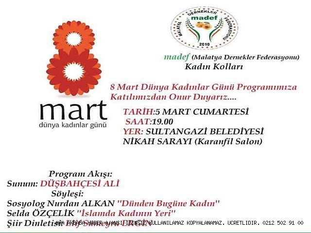 MADEF 8 Mart dünya kadınlar günü münasebetiyle 5 mart günü " kadınların dünü bugünü ve İslamda kadın konulu bir panel düzenlenliyor.Sultangazi Kültür merkezinde yapılacak panelin sunumunu Radyo ve Tv program yapımcısı Düş bahçesi Ali yaparken Sosyolog Nurdan Alkan ve Selda Özçelik konuşmacı olarak katılacak. Malatya dernekler federesyonu başkanlığı Bu özel gün münasebetiyle davet yayınladı.